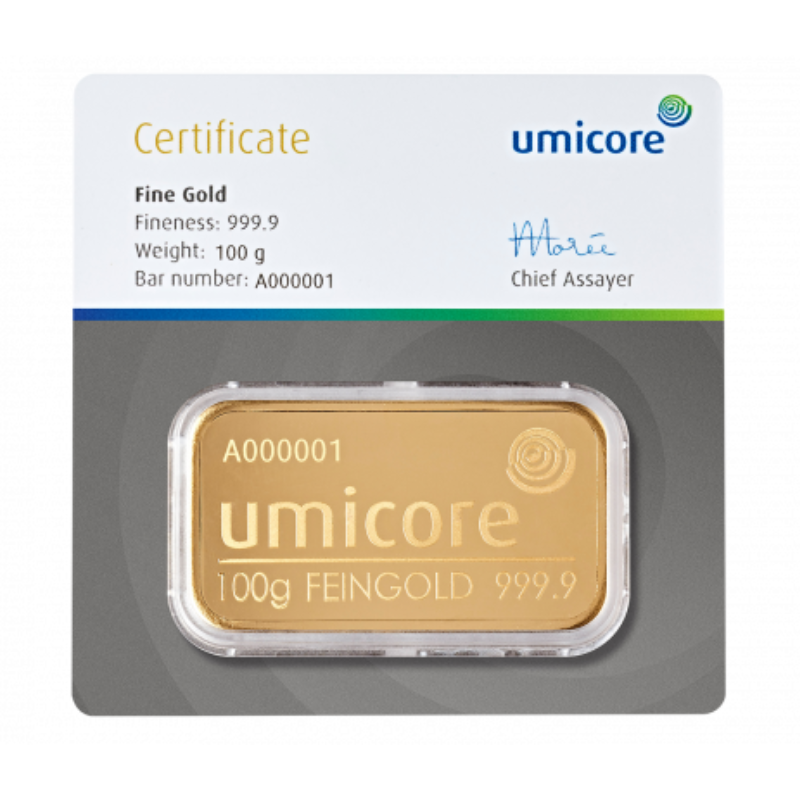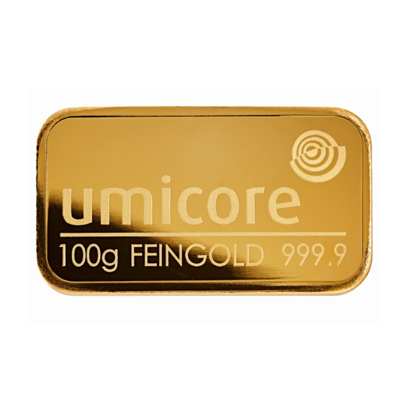 Umicore 100 gram goudbaar (LBMA-gecertificeerd)