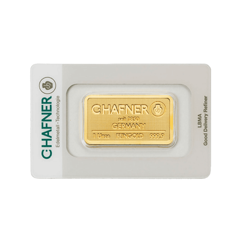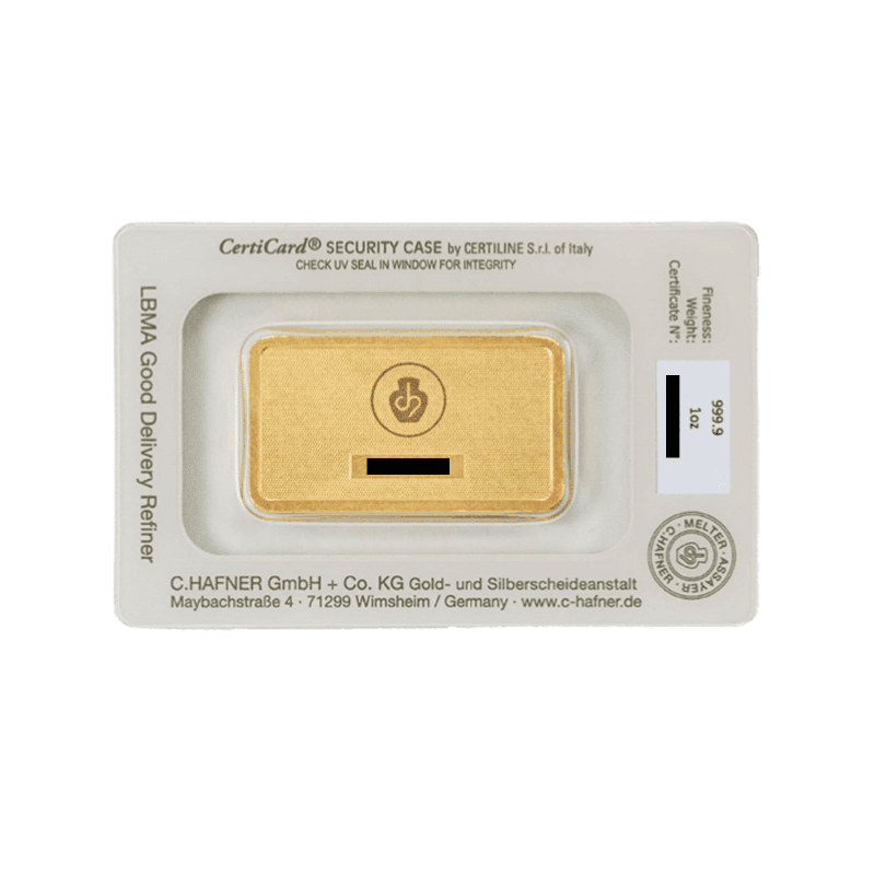 C. Hafner is een Duitse edelmetaalproducent die is genoteerd op de London Bullion Market Association (LBMA) Good Delivery List. Dit garandeert dat de 1 troy ounce goudbaar internationaal verhandelbaar is zonder aanvullende keuringen.